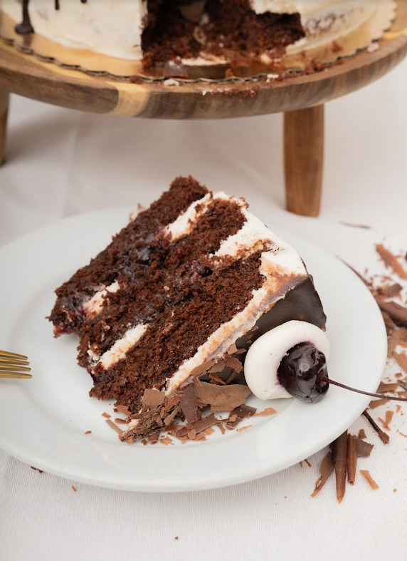 Three layers of chocolate cake, cherry filling, vanilla buttercream, chocolate shavings, dark cherries.
